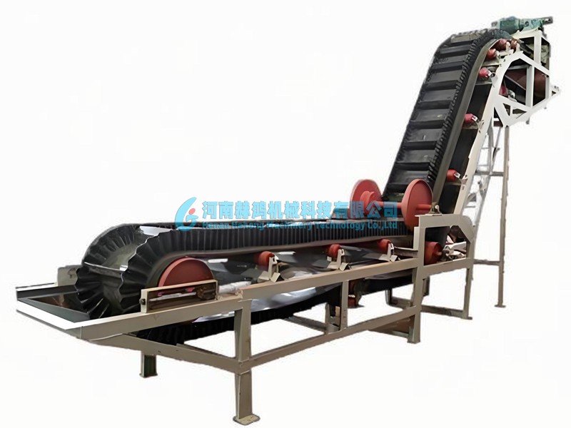 大傾角輸送機(jī)是一種專門設(shè)計(jì)用于在陡峭坡度上高效、連續(xù)地輸送各種散狀物料的輸送設(shè)備。大傾角輸送機(jī)的輸送帶具有波狀擋邊(裙邊)和橫向隔板(橫隔板)。波狀擋邊位于輸送帶兩側(cè),形成類似“堤壩”的結(jié)構(gòu),防止物料從兩側(cè)撒漏。橫向隔板以一定間距固定在基帶和擋邊之間,形成一個(gè)個(gè)封閉或半封閉的“格倉(cāng)”(料斗),有效承載物料并阻止其在傾斜段下滑。